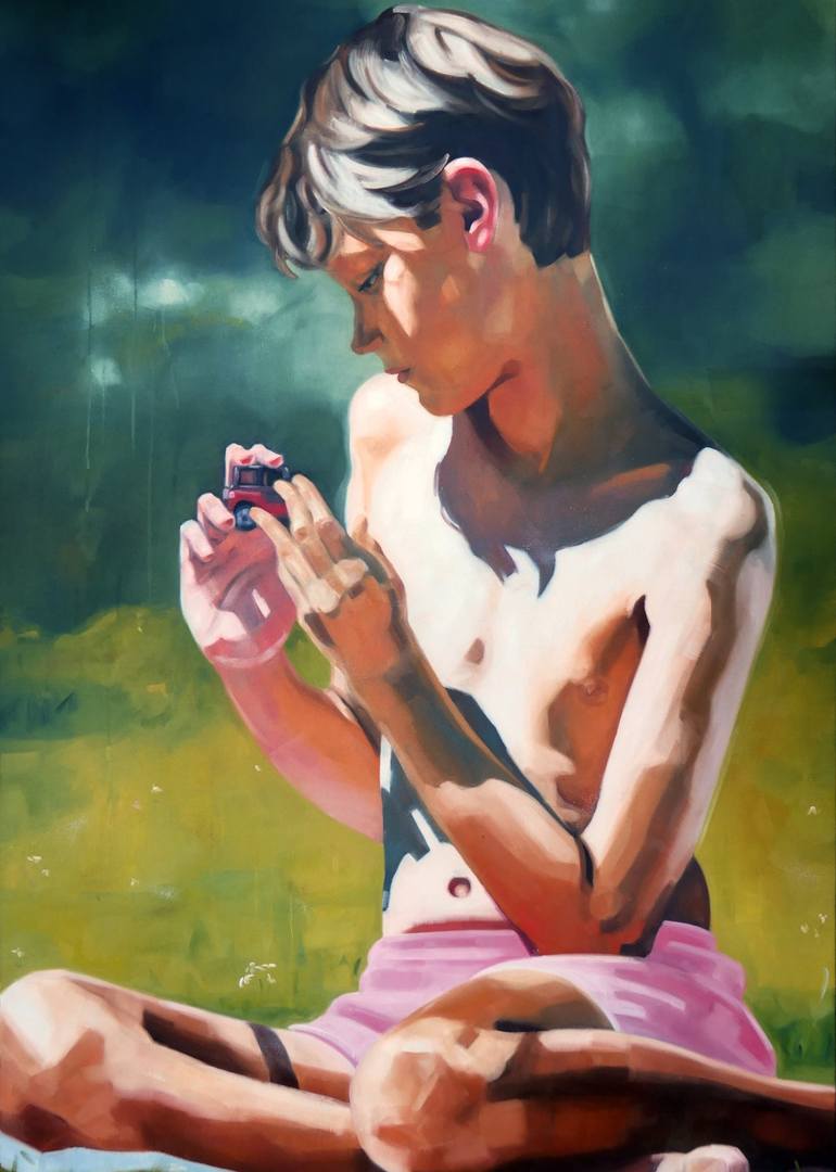 The child seems almost too old to play with the little toy car. Could be a symbol for his childhood, that will soon end. I constantly get inspired by the human body. I especially love interesting light situations and skin colours. The sculptural aspect is also very obvious in my paintings. I hard...