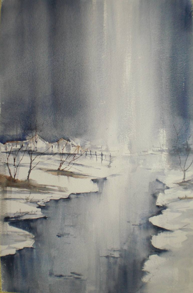 a river in a winter landscape; a winter atmosphere for this watercolor This artwork is done on 300 g Fabriano Artistico watercolor paper with Winsor&Newton colors. Signed on the front, the Certificate of Authenticity is included.