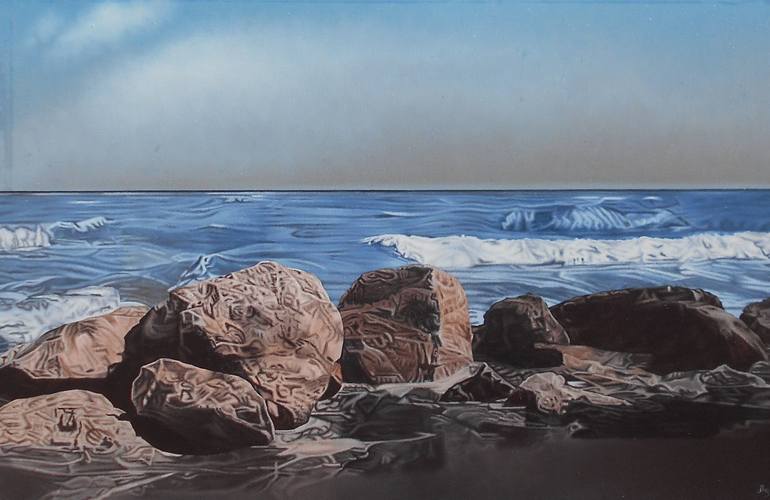 rocas sobr.e la playa ess un trabajo elaborado sobre oleo sobre lienzo, en un estilo realismo contemporaneo