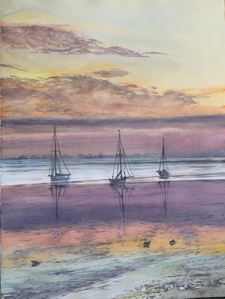 This painting "Sailboat at Sunset" is filled with warmth and peace. Today I woke up with the thought that I really want to go to the sea. I missed I imagined myself on one of these boats. A warm sunset, lilac clouds and the calm surface of the sea create a unique romantic evening atmosphere. The sil...