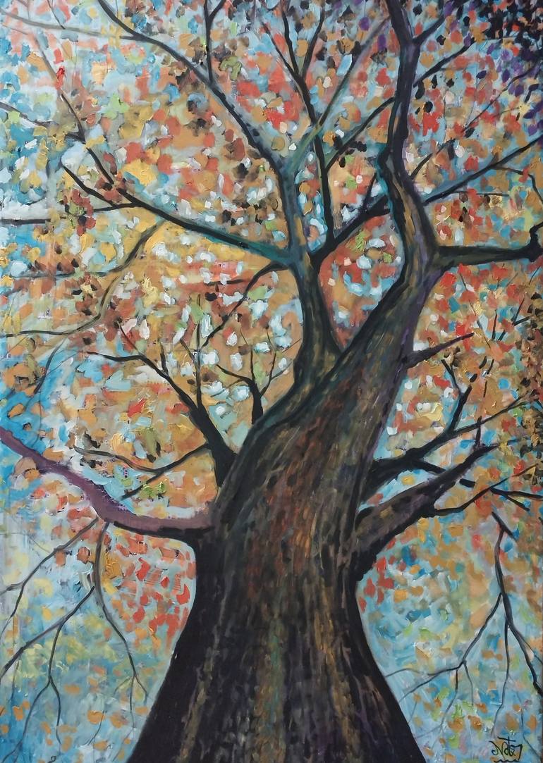 This original oil painting on canvas, titled "sombra árbol, zuhaitzaren itzalea, shade tree, l'ombre l'arbre," captures the protective essence of nature. The artist's modern style brings to life a robust oak, its branches laden with leaves in the warm hues of autumn. The strong trunk stands as a for...