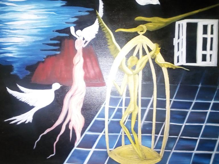 the painting is inspired by people,who are angels or shining stars inside,but they don t look inside them and looking for that the other people.and they are like birds in the bird-cage
