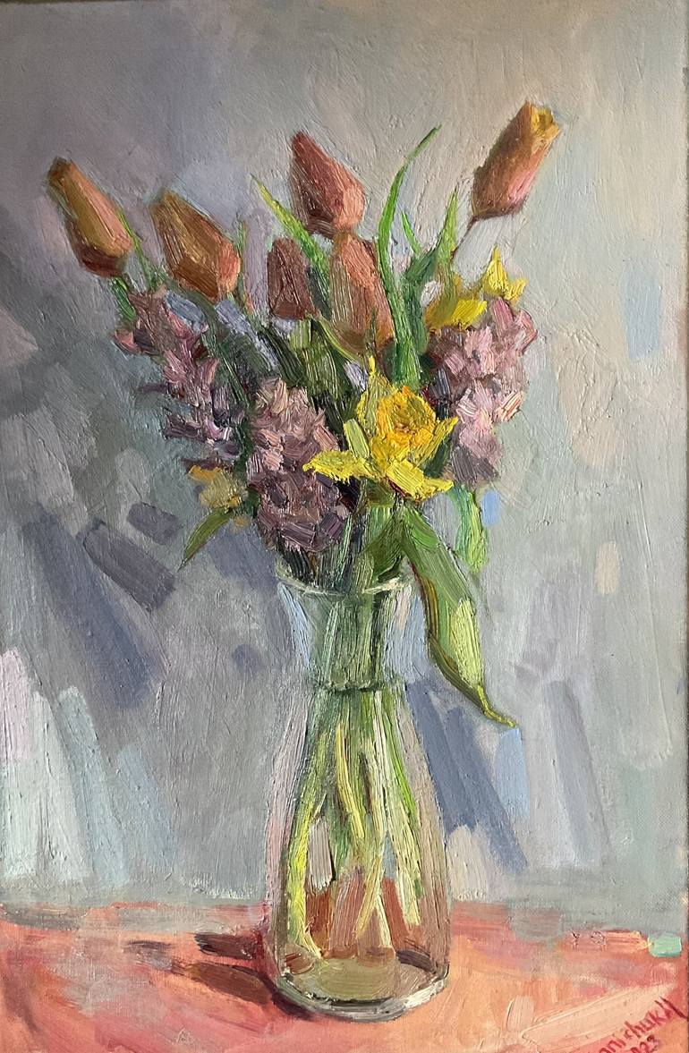 Spring flowers in a vase are a joy, even if the weather is not very good. Spring is my favorite time of year, and this is already a sufficient reason to paint spring flowers in oils)) It’s amazing what beauty you can buy for a couple of euros in a store, and then paint it in oil so that it will deli...
