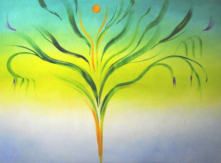 Surrealistic landscape painting depicting summer field plant on lazure blue/ fresh green landscape. I wish it could bring fresh optimistic mood. Moreorver the shape of plant brings the form of the plant refers to female shapes, the uterus. Created in summer 2014.