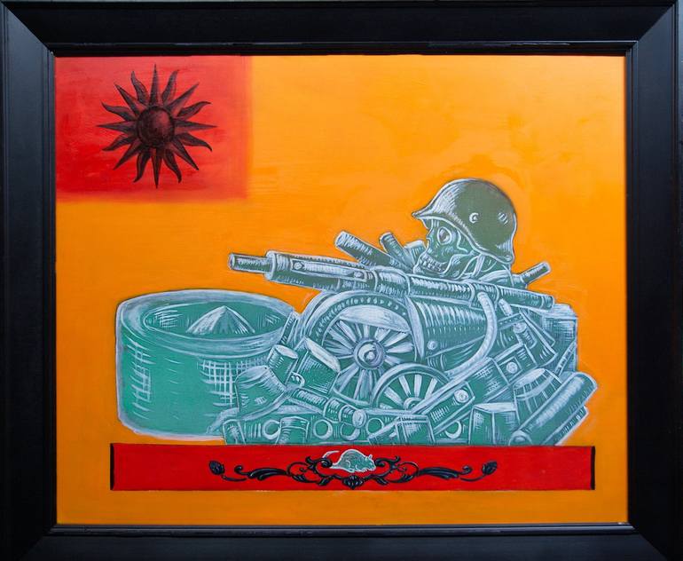 In Steel Age, the iconography of war condenses into a monumental still life of destruction. A skull wearing a steel helmet emerges from a heap of military debris — wheels, ammunition, and mechanical fragments. The scene is both structured and chaotic, like an industrial relic of past battles. A vivi...