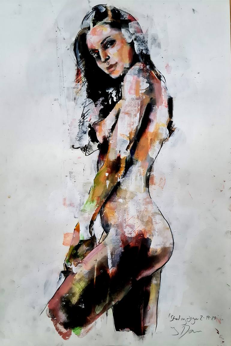 standing figure 2-19-24 is a medium-scale female figure in inks and soft pastels on 200gms paper. The use of fluid mediums such as inks, watercolors and acrylics allows for a certain element of chance within the drawing and are produced quickly using expressive marks and stains, giving them an ‘im...