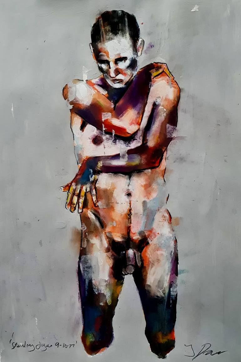 standing figure 9-18-23 is a medium-scale male figure in inks, watercolors, Acrylic and soft pastels on 200gms paper. The use of fluid mediums such as inks, watercolors, and acrylics allows for a certain element of chance within the drawing and are produced quickly using expressive marks and stains...