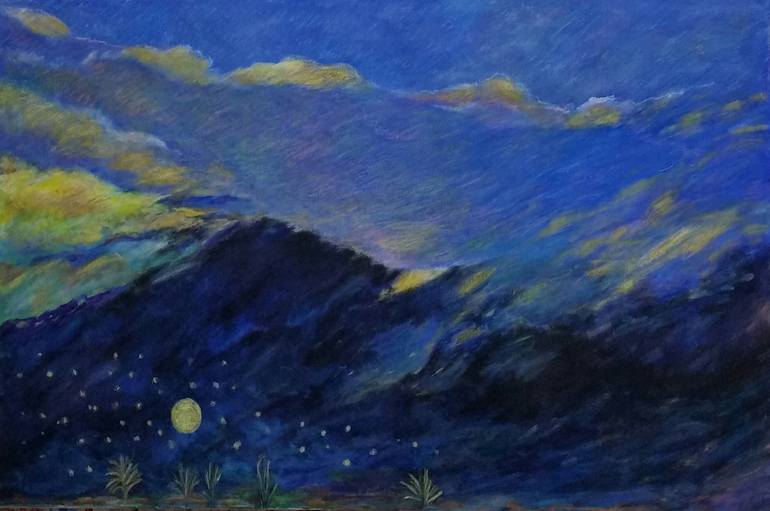 Starting with a detail of one of my paintings it developed as a huge wave, big clouds and my small village with the moon and the stars! I never know where I am going, it just happens ! I suppose that my inner thoughts influence my work/my lovely kibbutz on the sea-side and the stormy world outside.....