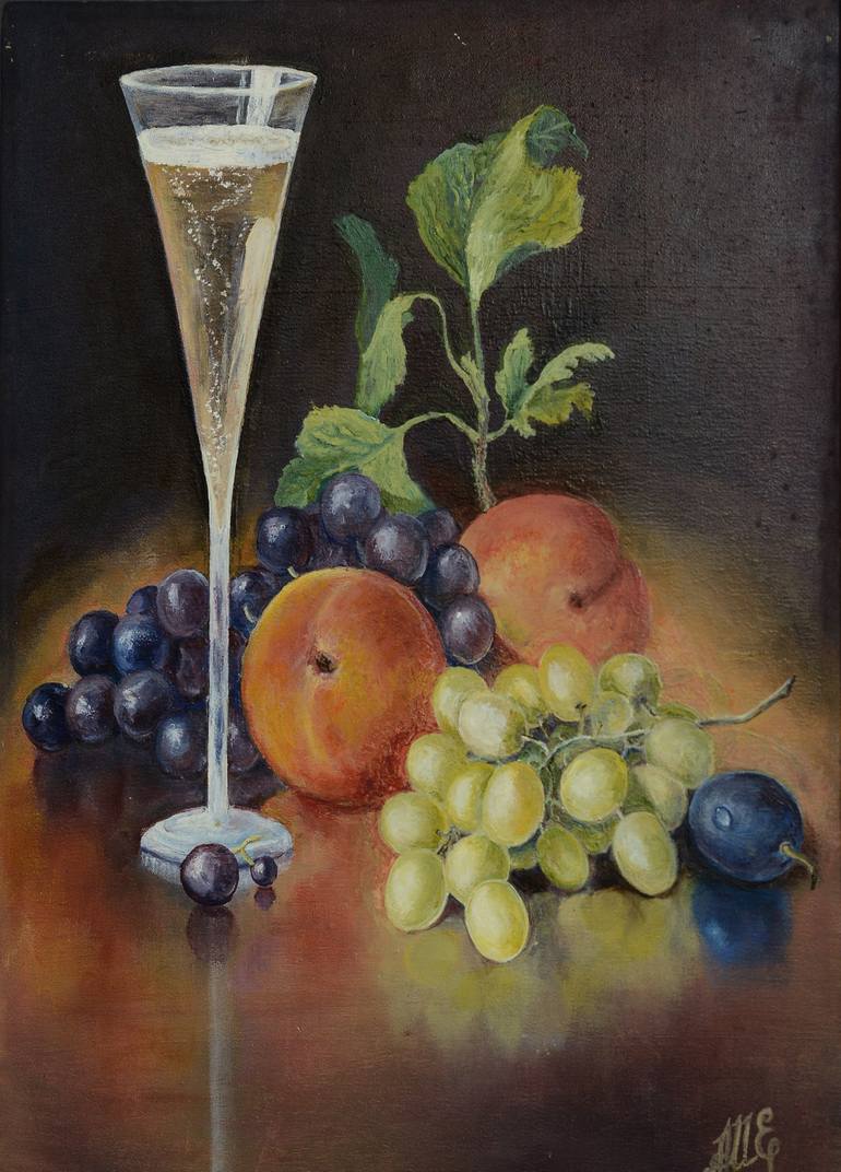The fruits on the table are laid out so that each of them is clearly visible. There is no center in the composition: both a champagne glass and a fruit basket play its role.