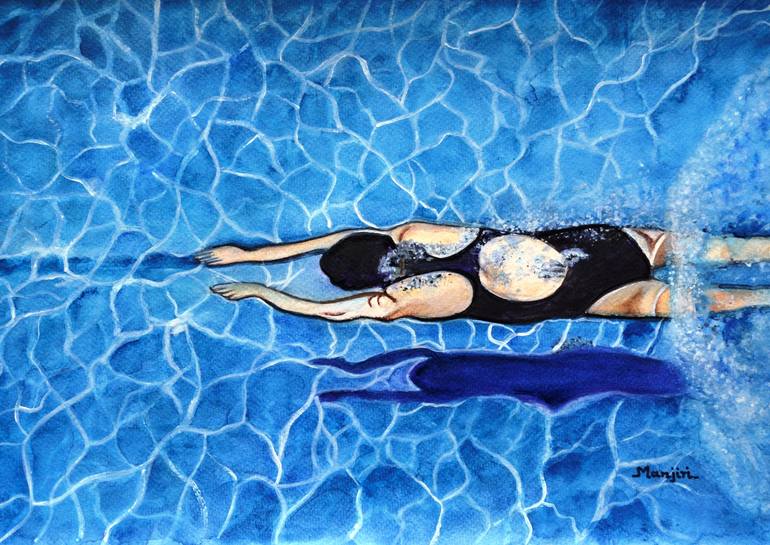 Unique underwater painting of women swimmer having fun on a hot summer day. This painting is done using watercolors, acrylic and gouache. It will add a splash of color to any décor and will look beautiful in any frame of choice. Medium: Mixed media on Watercolor paper Size: 16.5 x 12 inches (A3) C...