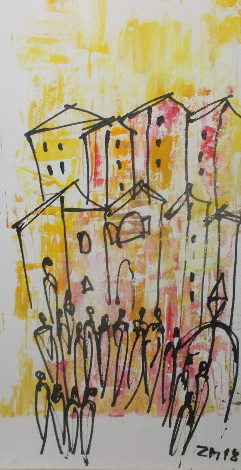 somerwhere in the south, sunny holiday feeling, people in the streets, acrylic painting with drawing elements