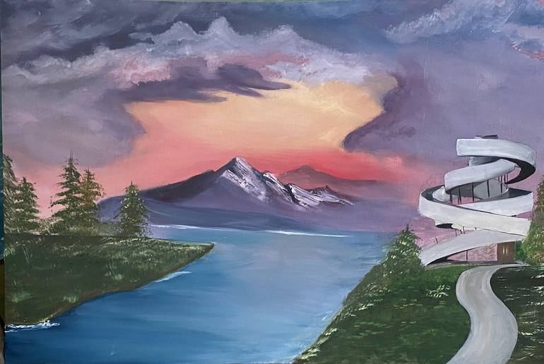 This gorgeous painting is a unique mix of Bob ross's famous 'sunset aglow' painting and the famous organic architecture example ' the ribbon chapel'. The concept was to merge and old famous painting with a modern world element. hence what better to compliment the nature than a beautiful architectura...