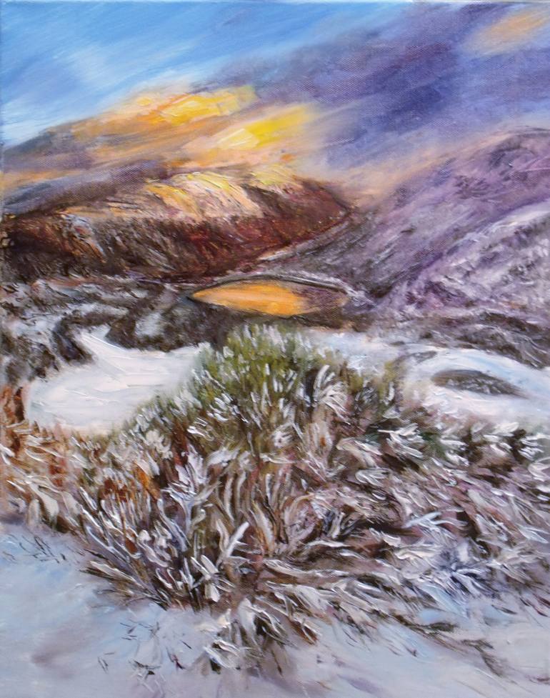 landscape with mountings, lake, snow and plants in sunset light