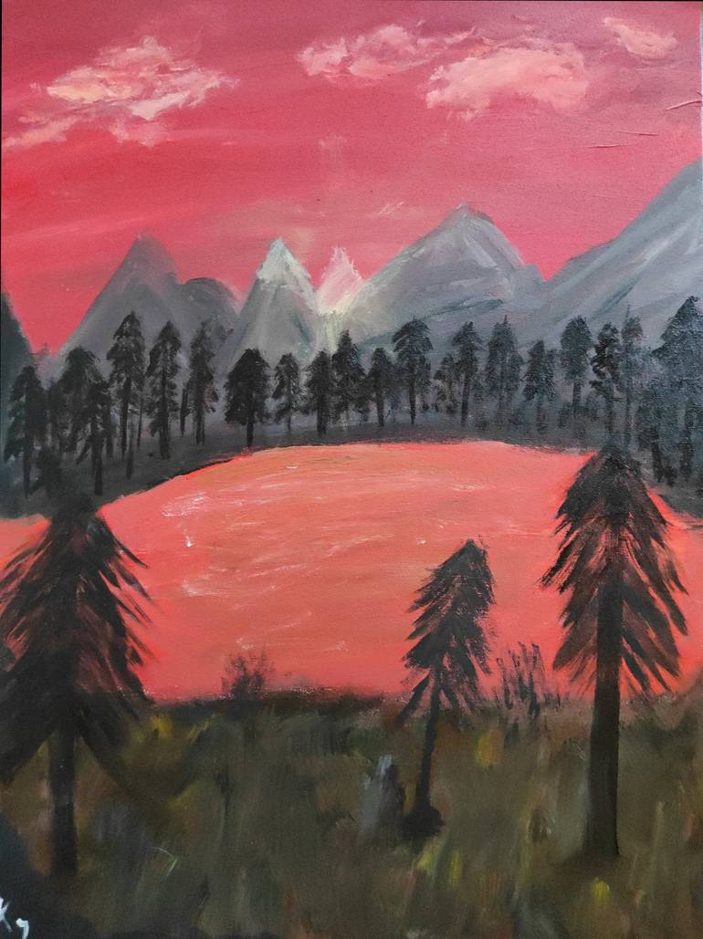 with surreal mountains of forest, a lake with a use of reddish color detached from reality.
