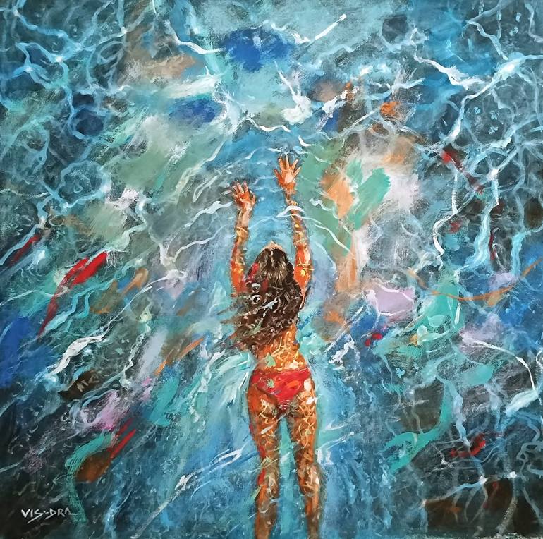 swimming painting on canvas in oil in pop style, sides painted ready to hang