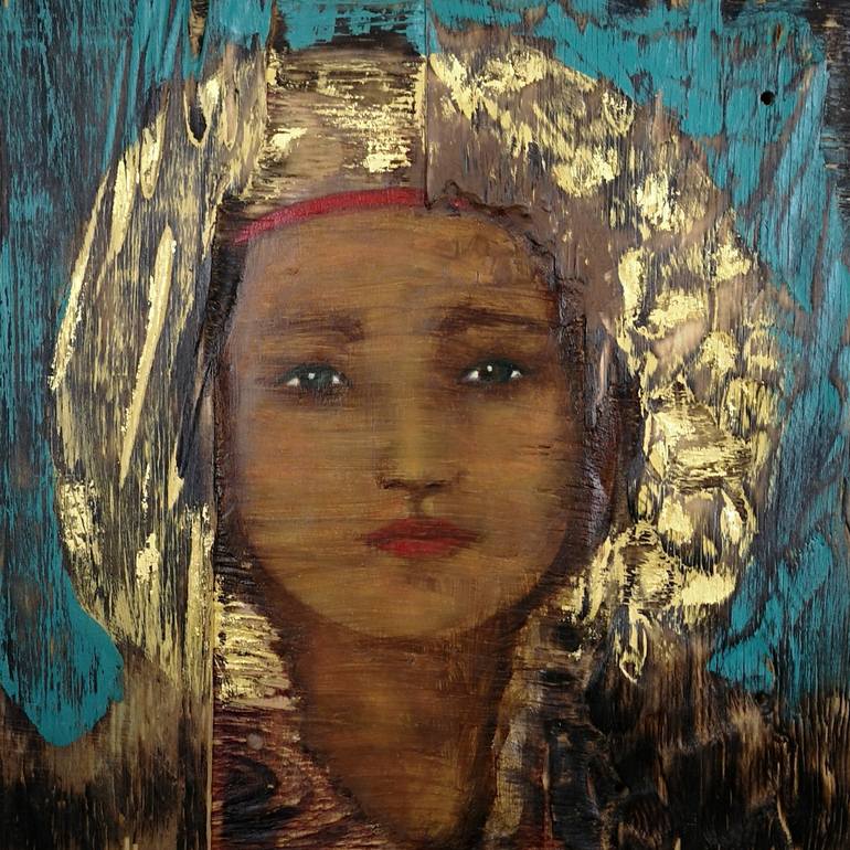 Both my husband, Markus, and I are fine artists, although he tends to make abstracts with mixed media, while I have always painted portraits, as I love faces! One day Markus came to me with a painting that he had done - a wonderful raw background of scorched, painted and sanded wood, which had a p...