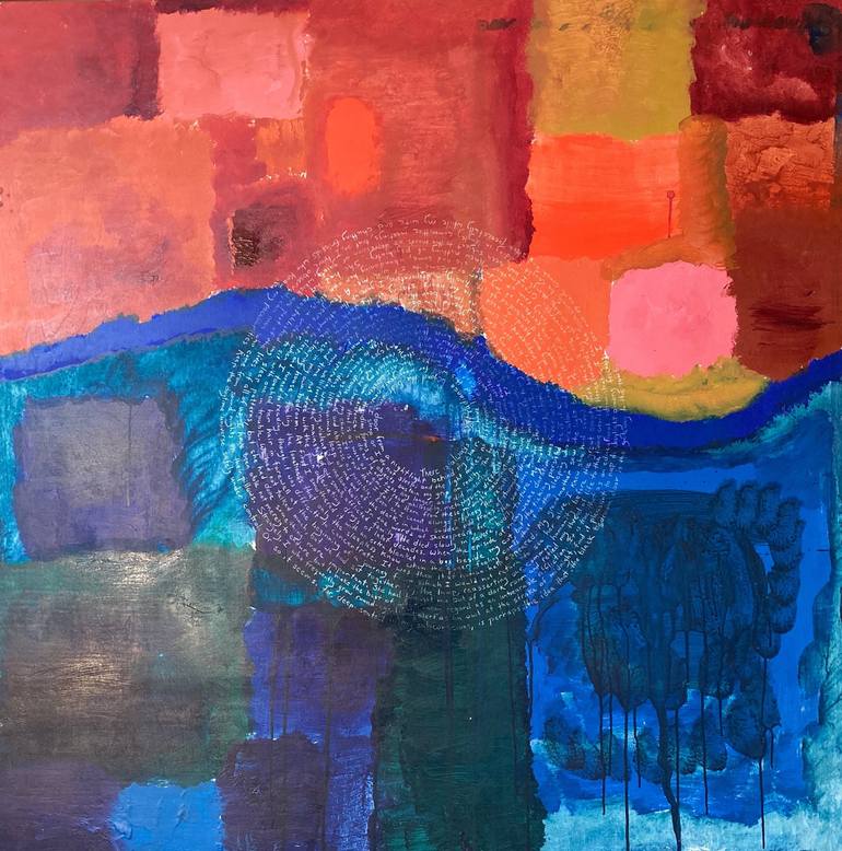The work itself. The painting. The ink work. Calligraphy. The psychic state of work-driven contemplation that focuses the mind, heightens awareness, frees the ego and makes time dissolve. That is what drives me. I work from the kernel of an idea or a feeling; not a plan. Even when there is a design, my work is spontaneous, improvisational, jazz-like. My precision is imprecise, my exactness is inexact. Perfection is a temptation and an enemy. My work invites close inspection: contemplation of imprecision, inexactness and imperfection. Many of my pieces have multiple layers. They have their own history, manifold incarnations, patterns that compete with one another, contrast, complement, build complexity, or reduce to simplicity. For nearly 30 years I have worked consistently and intensively in the studio. Beginning with assembled objects in painted boxes, one medium led to another, one style to another in an ongoing intuitive exploration. Three-dimensional assemblages led to two-dimensional collages I dubbed ‘woven photos.’ Then followed three-dimensional ‘tape on books’: books mummified within quilt patterns of colorful electricians tape. Then abstract painting: vaporous landscapes; neo-geometric; anti-minimalist; text-based paintings that challenge comprehension or shout TRUTH; post-modern mandalas; multi-layered matrices; constructivist networks; paintings sawed into pieces and recombined into mosaics. And whenever I butt-up against a dead-end in my painting, I reach for paper and sumi ink to simplify my thoughts or simply explode using traditional calligraphy brushes or non-traditional brushes with super-long bristles. When I paint on plywood panels I build hardwood float frames. When I paint on canvas, it is loose canvas, and when the painting is finished I build the wooden frame and stretch the canvas.