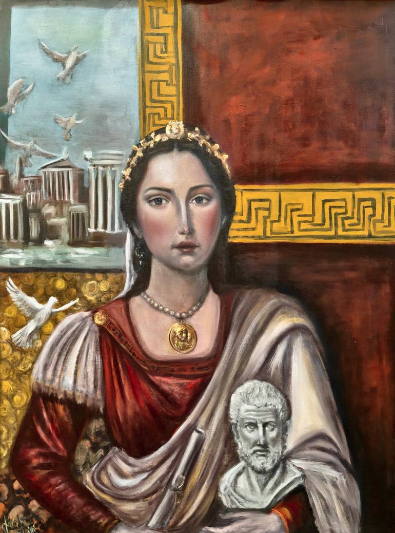 A classical Roman-Italian inspired painting of a queen holding a scroll, cradling a Roman statue in her arms, embodying reverence and timeless elegance.