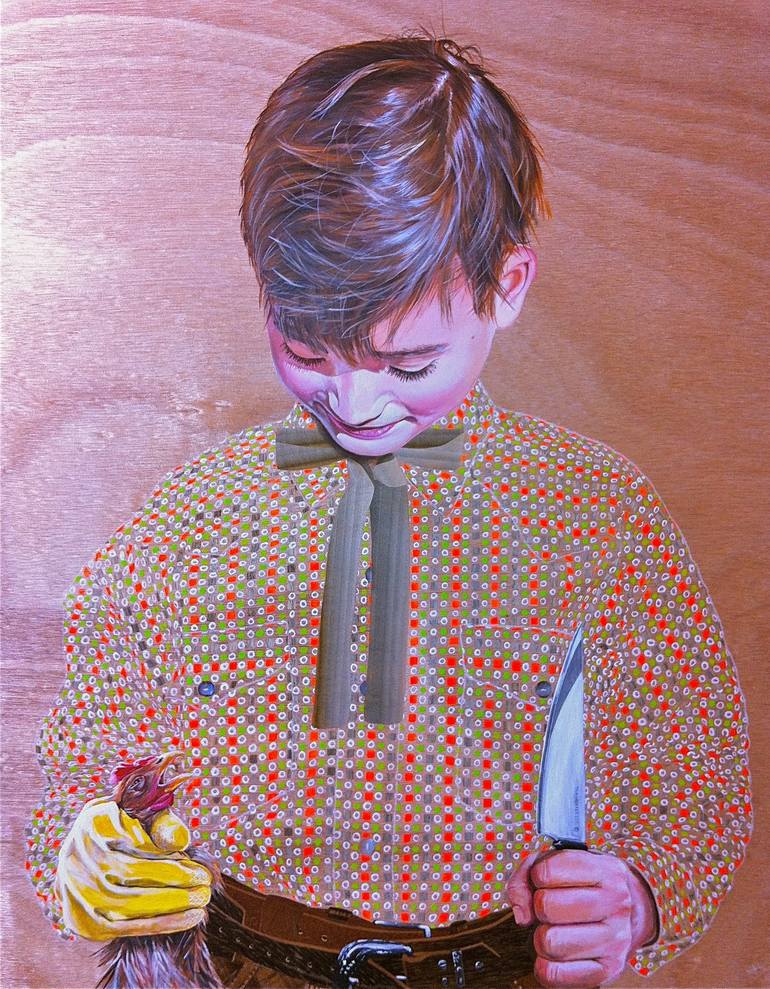 Always been asked why I have chosen to work with wood I can only say that I love this material for so many reasons. It brings its own story into the picture, it reveals its character while you work with it and keeps its final secret till the moment when you apply the first layer of laquer. Wood for ages was around people to create homes, warmth or to decorate. I think it is almost exclusively seen as something very positive and in my pictures it constitutes an inviting familiarity although one might find something unexpected behind trusted facades. I focus on people and try to portrait them as they would tell me the truth about who they are and what they have experienced. Moments of honesty, situations of importance provocing questions, answers and all kind of interpretations I want to conserve and to present in a neutral and subtle way. Very often these stories are about me. Mostly I avoid titles or symbols explaining too much or directing the viewers to a certain interpretation. Always searching for ambivalent facial expressions or circumstances I want to prevent the possibility of a clear, an absolute, an objective way of explanation. One should just feel it as an impulse and refer to ones own character. For me it is very exciting how different the spectators respond to what they see. And when they oscillate between two different ways of reading, such like between play or danger, trustfull naivity or aware coquetry, pure satisfaction or existential boredom it is like they would be stuck between the two sides of a medal. Although the need to paint aroused at an early age I followed different ways till I became a full time artist. Getting in contact with the fascinating technique of marquetry happened by coincidence and like painting I taught myself by reading books, copying old masters and trusting in the method of try and error. Now I combine the traditional craftsmanship with contemporary acrylic painting trying to blur the line between wood and paint.