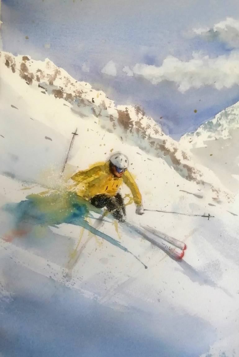 a skier is going down a steep slope; a sport action for this watercolor. This artwork is done on 300 g Fabriano Artistico watercolor paper with Winsor&Newton colors. Signed on the front, the Certificate of Authenticity is included. Please don't hesitate to get in touch with me if you have any qu...