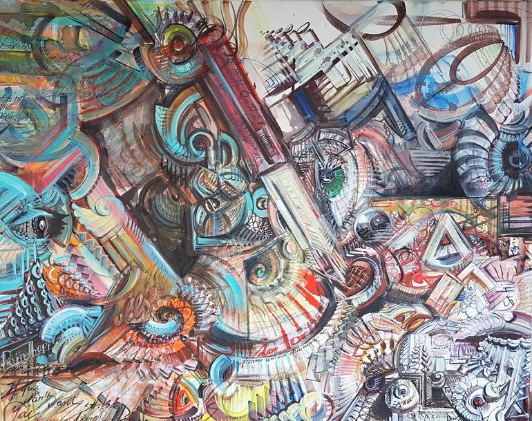 Eric Hubbes was born in London and spent his youth in Francfort and then in Cologne. After one year in Scotland at Glenalmond College, where he focused on fine arts, he knew that art was his passion. After graduating from high school, he studied geosciences with 3 successful semesters and mathematics before returning to art. he then develops design and watercolor in Cologne and acrylic painting in Bonn, from the Alanus Academy of Arts. He then decided to study Fine Ars at the University "HKU" in Utrecht. After 3 successful semesters he came back to Cologne to go his own way, the university was too restrictive for his creativity. Since then, he has been living and working in Cologne Over time, Eric Hubbes developed his own personal style in which he related abstract and figurative painting. This also creates a play between geometric shapes and writing, which can be found in all his works. You could also think of these as fantastical worlds emerging from his subconscious. This idea arose mainly from the brooding that every person is inclined to. His main concern is to reflect the questions and ambiguity of our time in his pictures.
