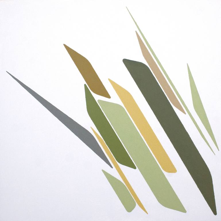 This painting belongs to the series 'geometric flora', where the artist experiments in the limits between figuration and abstraction . Each painting transmits the essence of plants to the viewer in an indirect way, through geometrical shapes and colours.