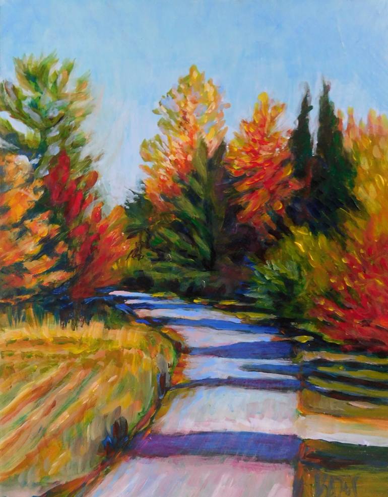 En plein air field sketch of a turning lane during peak color week in the fall, Adirondacks, New York.