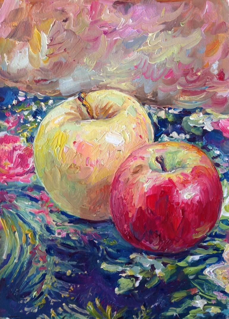 two, apple, still life, apple, painting, oil, original, motley, red, yellow