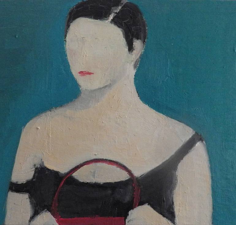 pale skinned woman in black dress, with a red bag held tightly in hand