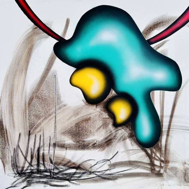Large graffiti-inspired square canvas, echoing the vibrant and playful style of Jeff Koons' balloon sculptures. This artwork combines airbrushed layers of green and yellow with a dynamic background crafted in oil pastel and charcoal for added depth and contrast. Each element of this mixed-media piec...
