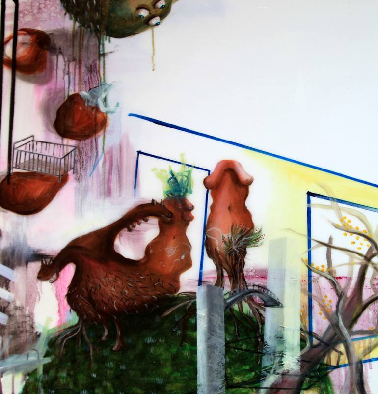 oil painting with clear resin on cotton canvas. The artwork is framed with white wooden edge. Surreal landscape with a mix of architecture, nature and deformed bodies and animals