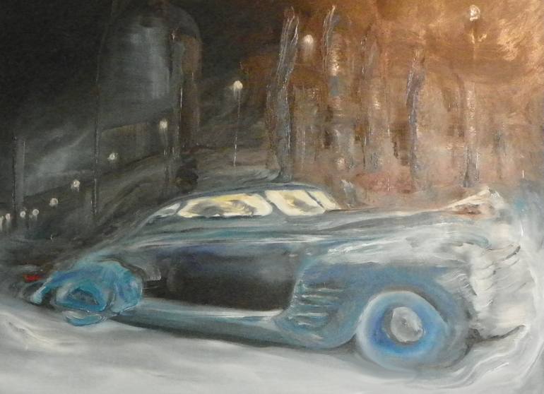 Old time car racing through the city. 36" x 48", oil on canvas.
