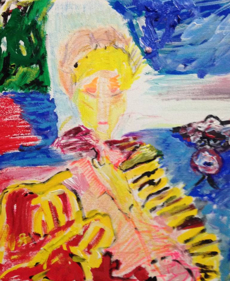 one of my graphic paintings dont be put of by the horror miss clockwork orange we are literal in emotion a work in acrylic textured pencil n marker on a good stretcher sides are yellow put in a nice yellow frame behind glass signed n dated will send flatpack
