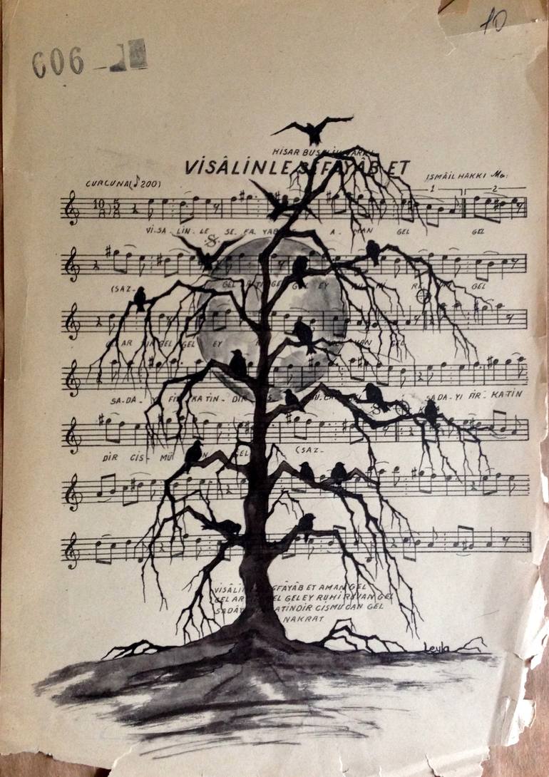 I used ink and pen on vintage music paper. This vintage nota paper at least 70 years old....and telling a story about Ottoman language...