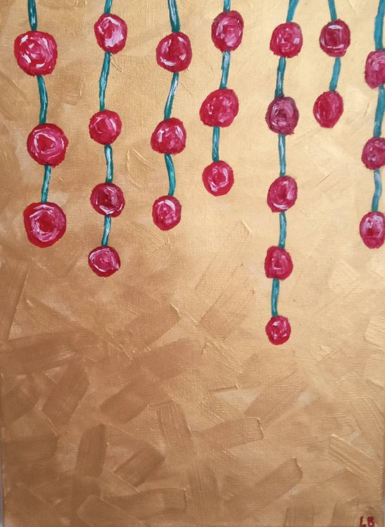 gold background symbol of luxury. roses are a symbol of beauty. hanging down is a symbol of lightness. luxurious beauty in lightness. circumscribed flowers hanging on vines on a golden background. for me it is modern, easy and unusual. Suitable for any interior I think. Unfortunately, the photograph...