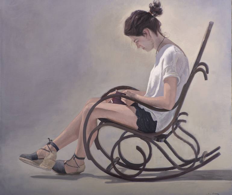 In this painting, a young woman seated at a rocking chair is shown absorbed in reading a book, capturing a moment of summer serenity. Depicted from the left side, it complements the previous painting, where she is portrayed from the right, thus exploring the duality of her being. The warm summer lig...