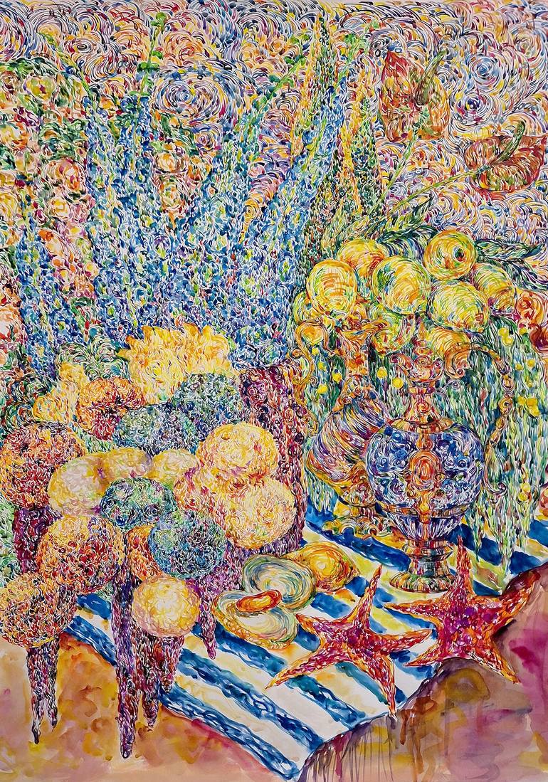 The painting features an exuberant blend of nature's bounty, showcasing an array of flowers and fruits in a mesmerizing swirl of colors. Each stroke captures the essence of life, celebrating the rich diversity of shapes and hues found in nature. The composition draws the eye with its dynamic arrange...