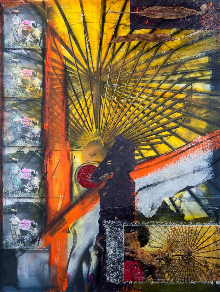 "11 Geishas", 2013, 40"h x 3040"w x 1.5"d Deconstruction Photography, digital photo images, multiple film transfer, rice paper, acrylic and charcoal on canvas.