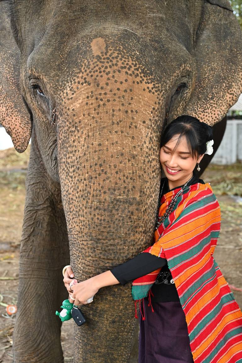 This photo has been taken in Thailand during a Festival, feminine grace in contact with this imposing elephant symbolizing inner peace.