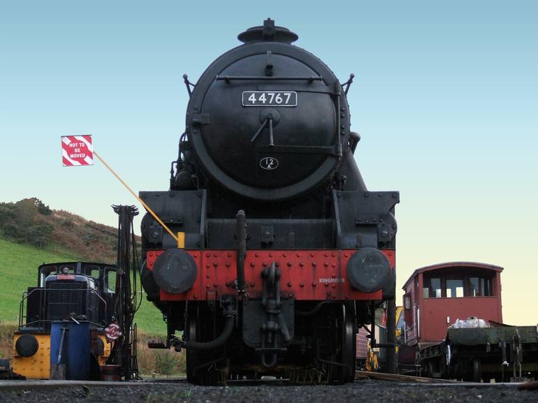 LMS Stanier Class 5 4-6-0 Black 5 44767 at Churnet Valley Railway in Staffordshire England. 4767 was completed on the last day of the LMS, 31 December 1947 at Crewe Works. It was unique amongst the 842-strong class in that it featured outside Stephenson link motion in addition to other experimental ...