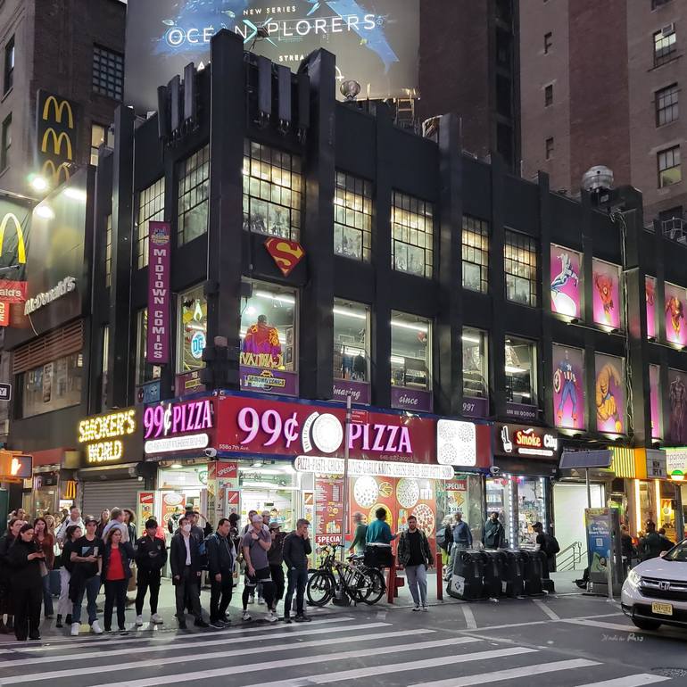 The 99 Cents Pizza store, McDonalds restaurant, Comics and Smoke stores, tabloid, more with the evening illumination. This is the crowd Midtown at 40 Street and 7th Avenue, NYC, USA. October, 2024. Open edition prints signed digitally by Artist.