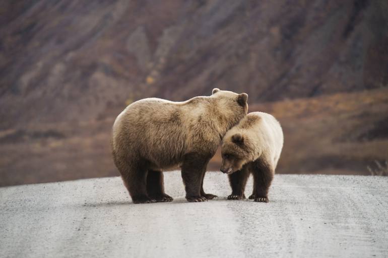 A mother cuddle with a yearling in Denali National Park. All large prints are an edition of 3, and are available in 20x30, 32x48, 40x60 & 48x72 (or similar size depending on the format of capture). All images medium format film camera or D800, and prints provided will be on top quality archival pap...