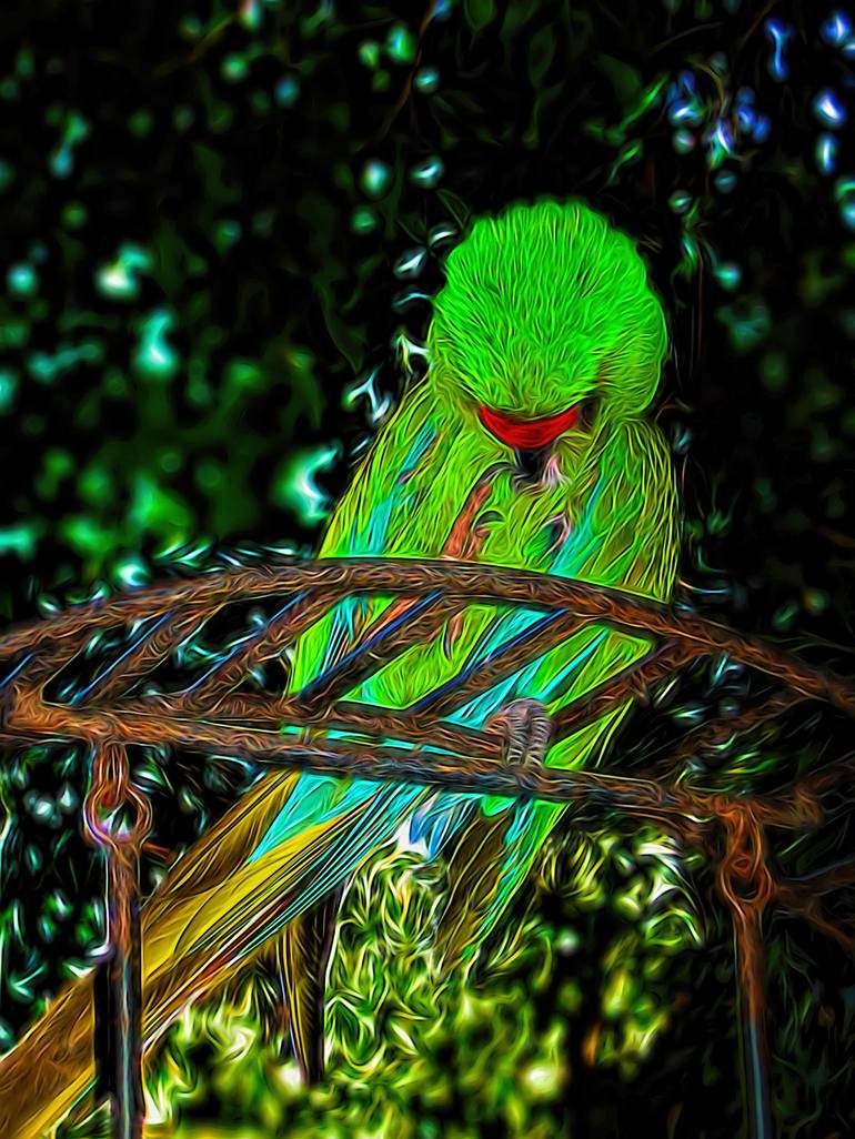 This green preening parrot was taken in El Quelite, Mexico. It was then digitally enhanced. This photograph captures the striking beauty of a vibrant green parrot, perched gracefully on a rustic metal structure. The parrot's feathers are a dazzling shade of green, with subtle hints of blue and yell...