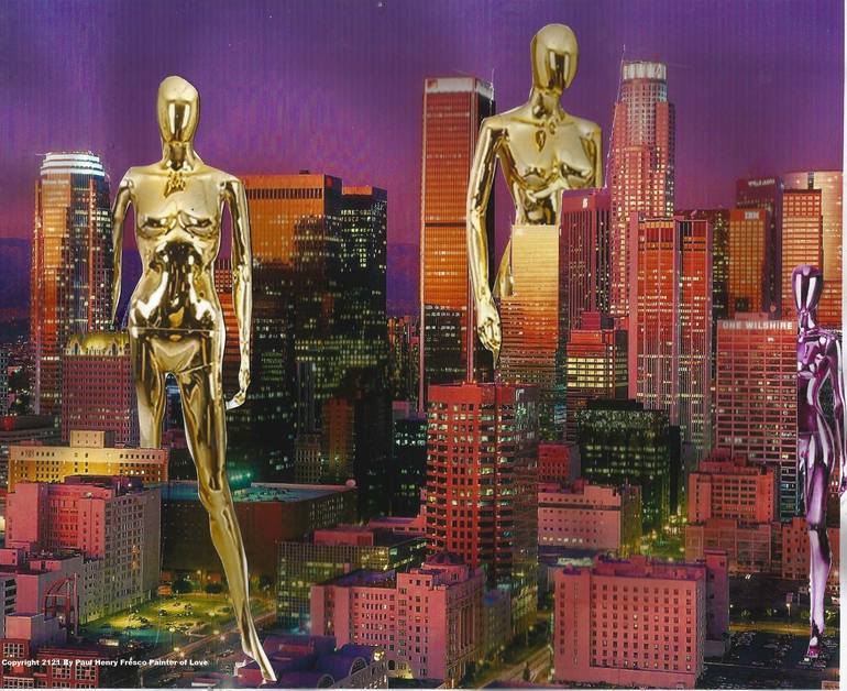 These conceptions come straight from my mind. This is a representation of the recent attack on Wilshire Boulevard by a group of 230 foot tall androids that descended from the flying saucer that was parked above Santa Monica Bay. They were eventually repelled by the recently developed neutron ray ...