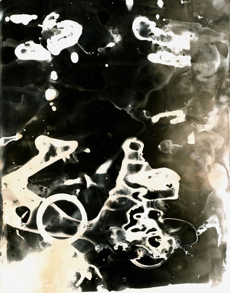 Black and white Alchemigram on Baryth gelatin photographic paper. An Alchemigram is a mixture of the analogue techniques of photogram, lumigram and chemigram. This one is made by carefully applying photographical and other chemical substances ( such as e.g. toilet-cleaner) on the photographic surfac...