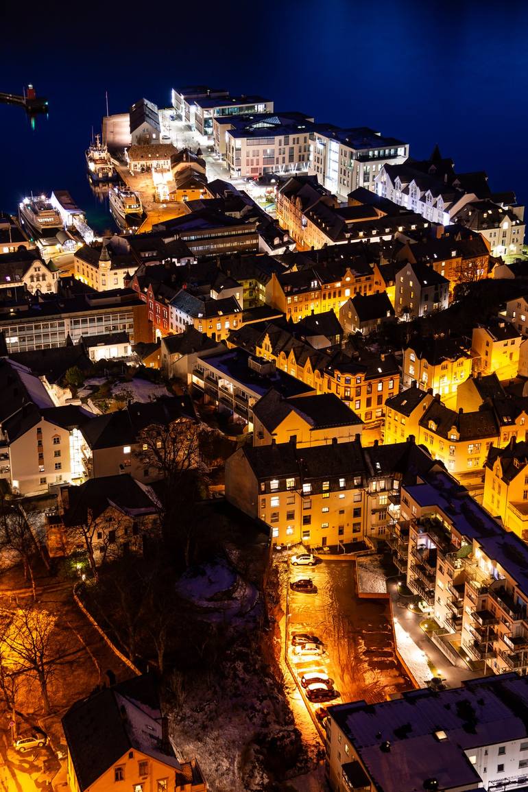 Night view of Alesund small Norwegian fishing village Scandinavia Northern Europe