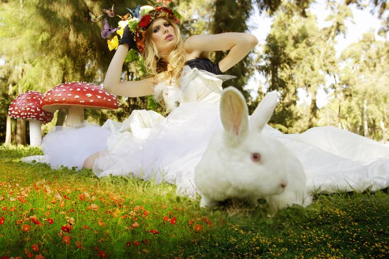 Alice in Wonderland rabbit fantasy in the woods fairy tale funny mushroom forest fashion