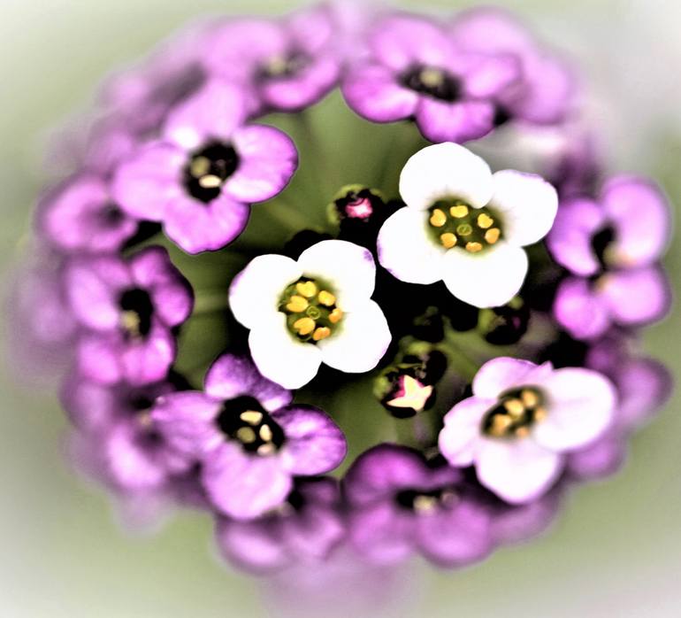 Spring flowers were the inspiration for a series of photographs displaying their macro up-close prettiness. The allysym flower shown here is beautifully scented, with tiny perfectly structured blooms on a small circular head. The photograph has been enhanced using digital manipulation techniques.