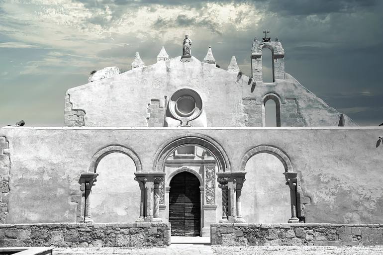 In this captivating black and white photograph, an ancient church stands as a timeless sentinel against the passage of years. Its weathered stone walls and intricate architectural details whisper stories of centuries past, each shadow and line etched with the history it has witnessed. Yet, above thi...