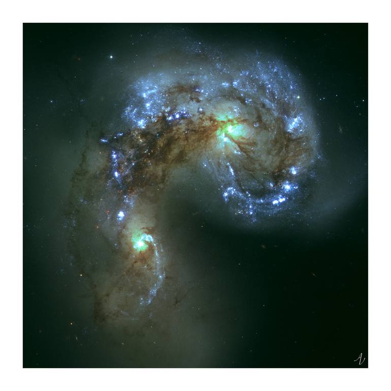 Antennae galaxies collisioning through Hubble telescope lens. Mounted, processed and edited by me.